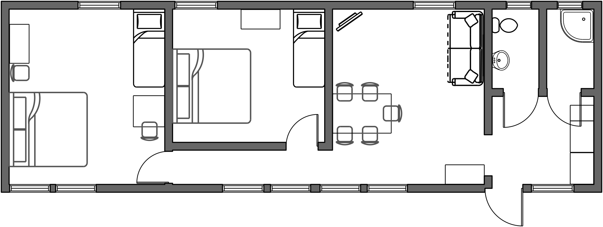 2 Schlafzimmer mit je einem Doppelbett sowie einem Einzelbett, WC + Dusche